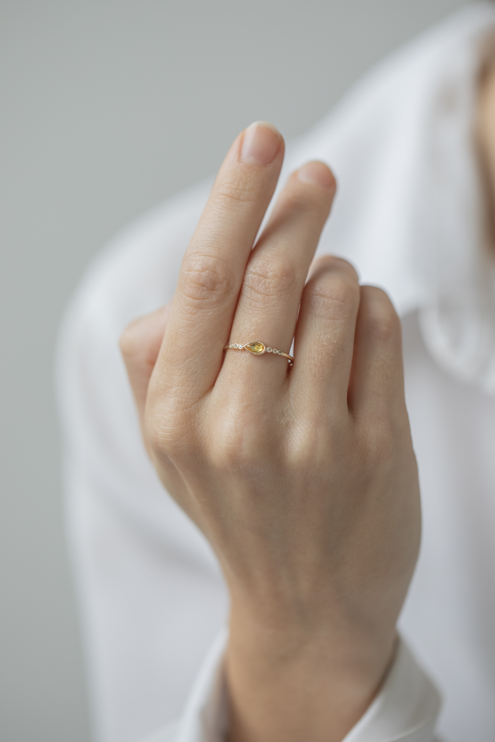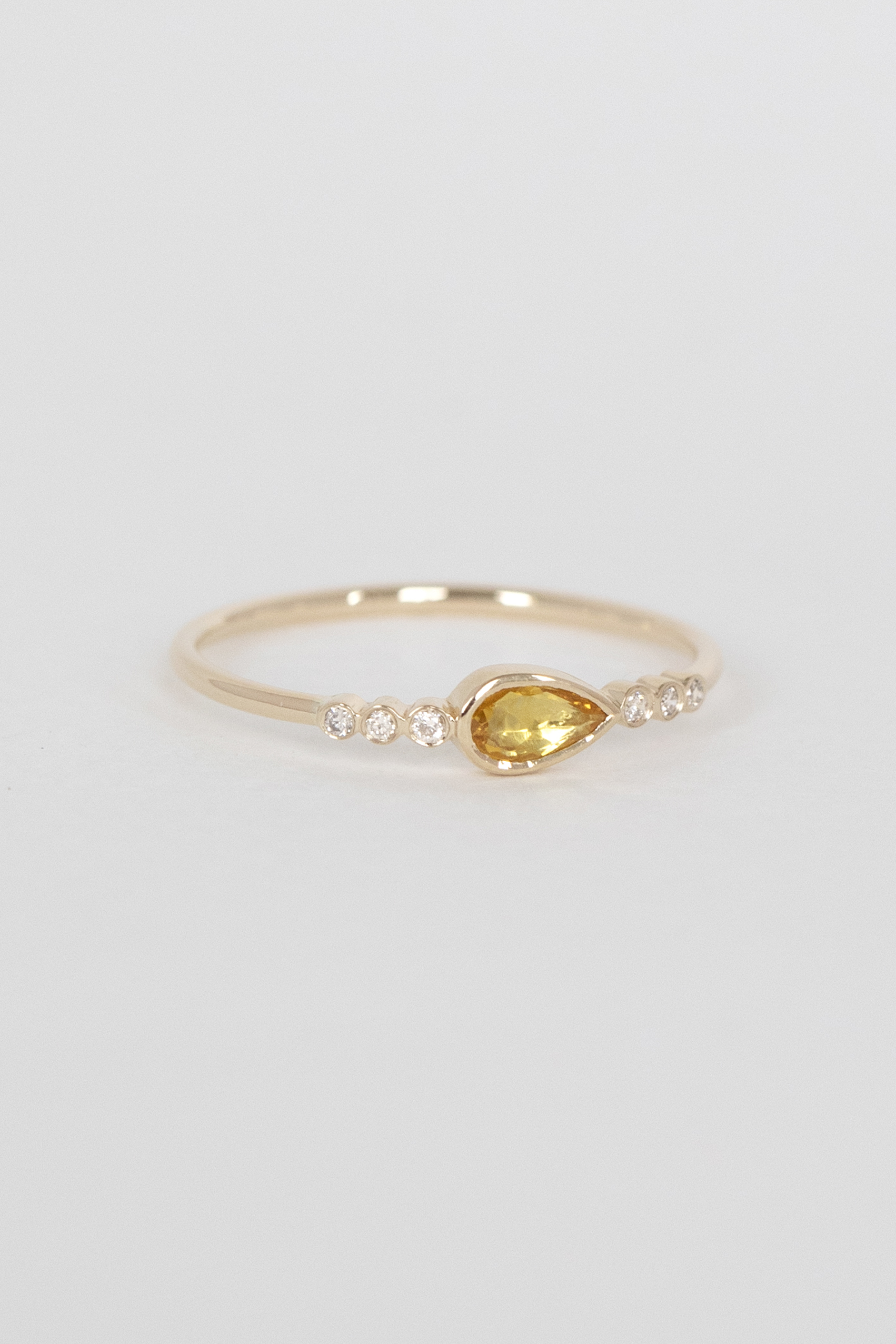 Céline Daoust 14k light yellow gold with one central yellow sapphire and six diamonds. The stone comes in a gradient of light yellow.
