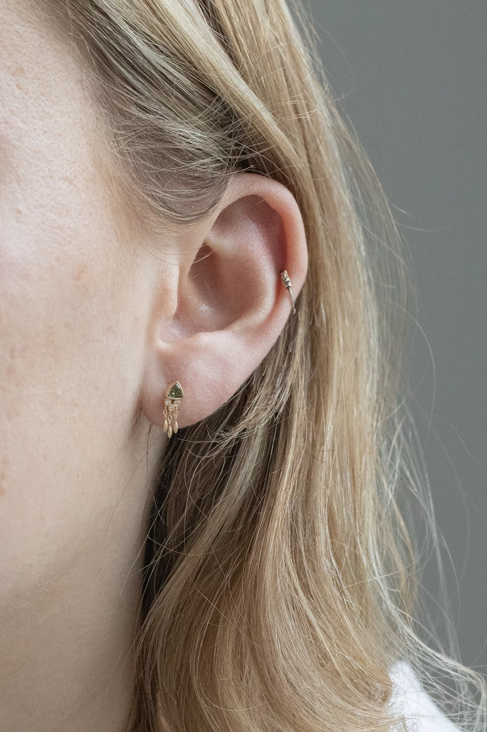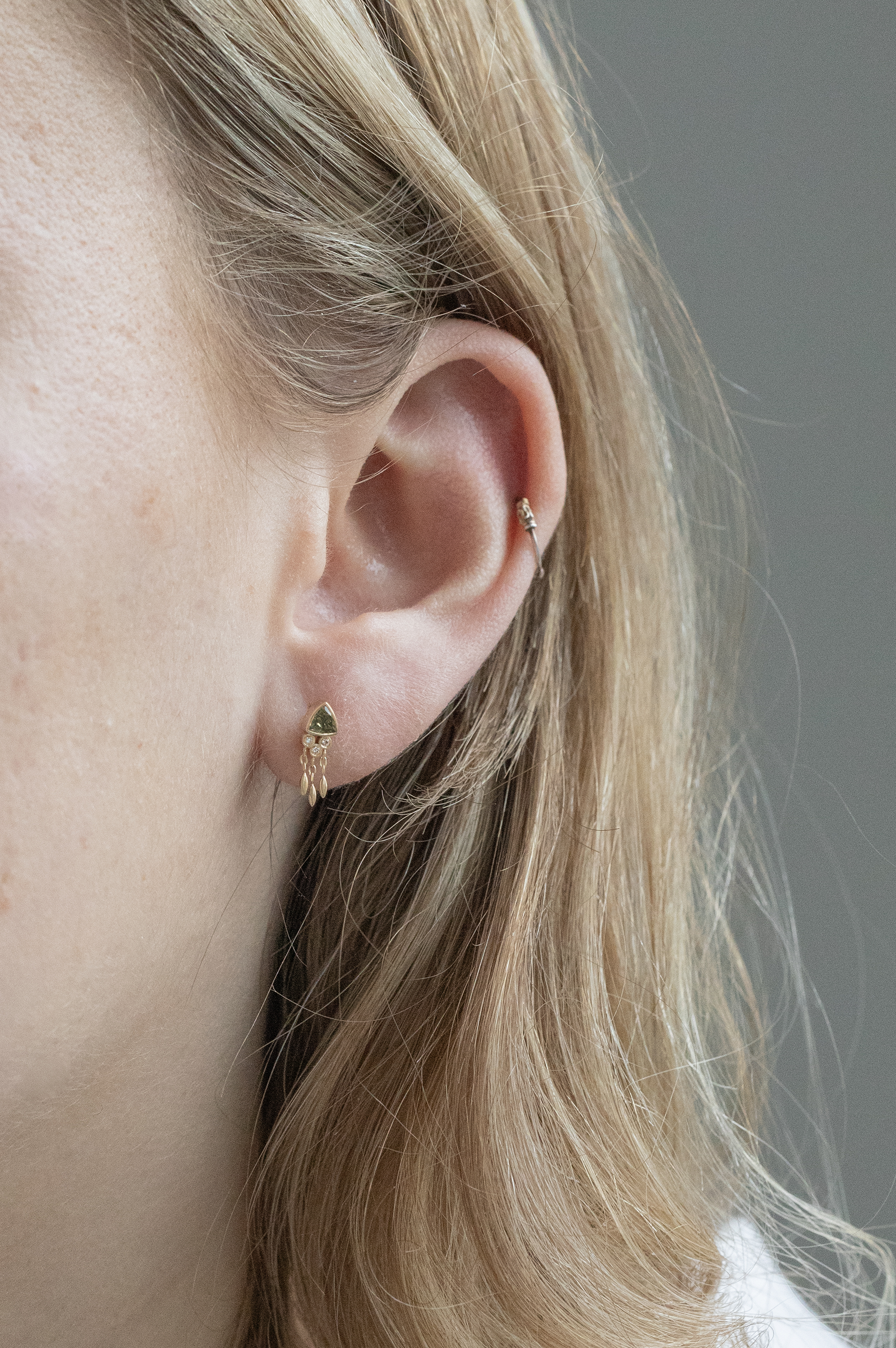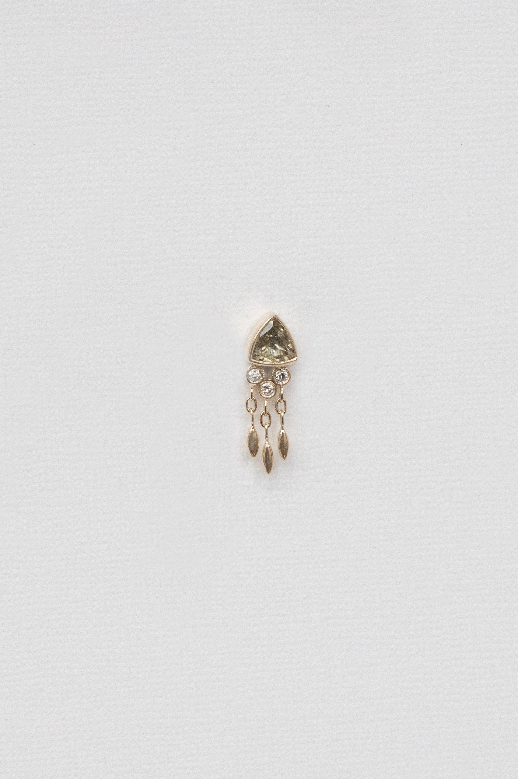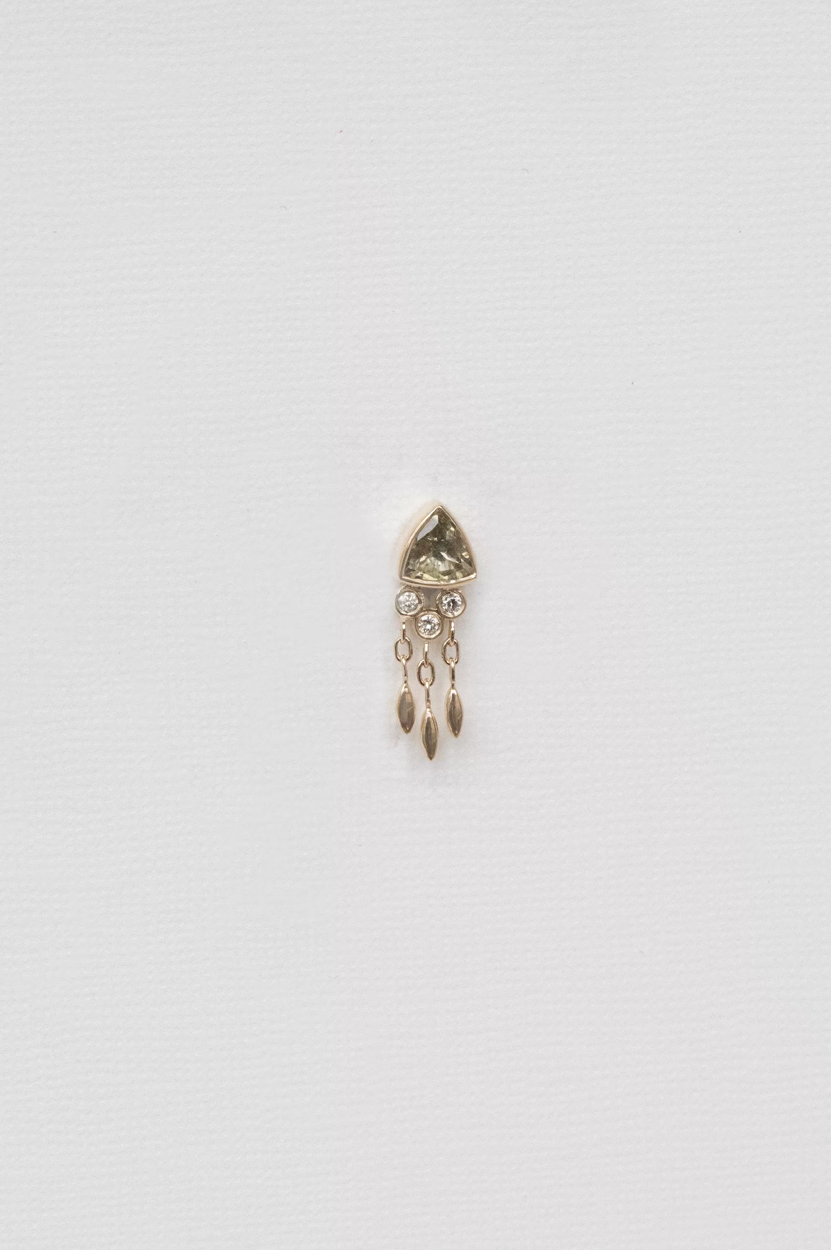 Celine Daoust 14k light yellow gold earring with one yellow/ sepia tourmaline, diamonds and dangling details.